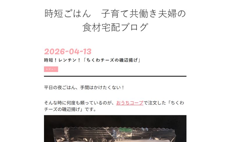 時短ごはん 子育て共働き夫婦の食材宅配ブログは、保育園児を育てる30代共働き夫婦のミドリさんが運営されている、食材宅配のおうちコープを実際に利用した共働き家庭のリアルな食材購入記録や、便利な冷凍食品、子供の好きな食品等を中心に紹介しているサイトです。